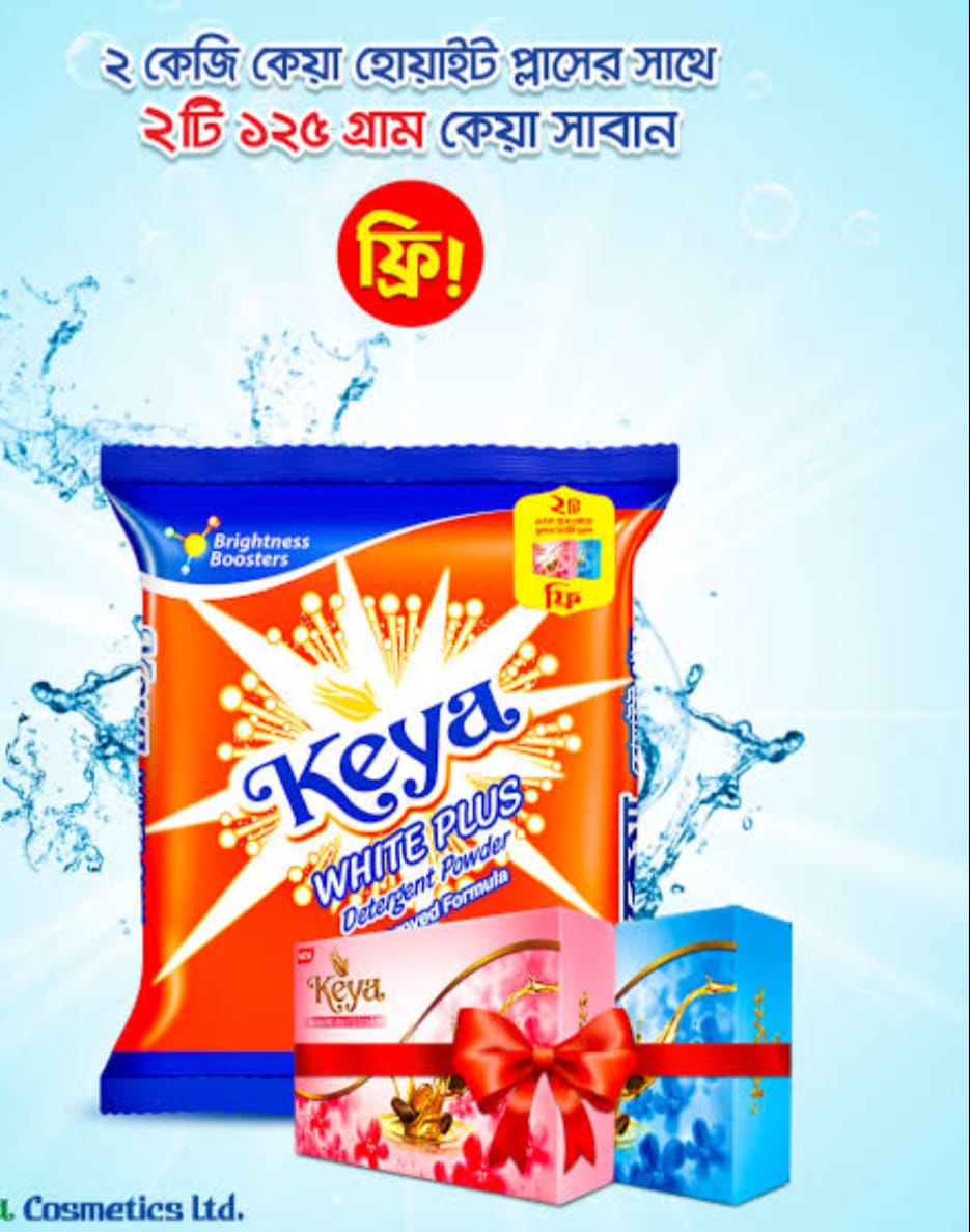 কেয়া হোয়াইট প্লাস ডিটারজেন্টের শক্তিশালী দাগ তুলার ক্ষমতা এবং কেয়া বিউটি সাবানের মিষ্টি সুগন্ধ এখন একসাথে! ২ কেজি ডিটারজেন্ট কিনলেই পাচ্ছেন একদম 💥 ফ্রি ২টি কেয়া সুপার বিউটি সাবান (১২৫ গ্রাম করে)।