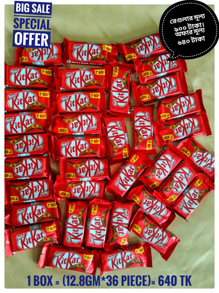 Offer-01. Kitkat 2 finger (small) 36piece per box only 640 tk. (Regular price 900tk)Offer-02.Kitkat 3 finger 28 piece per box only 1000 tk.